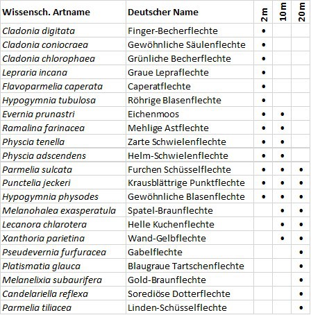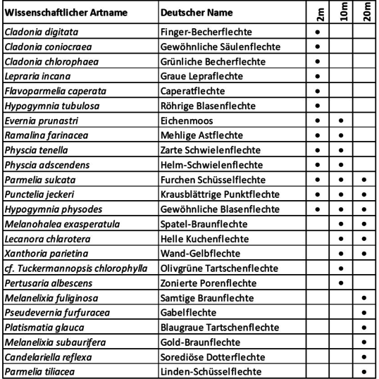 An einer mindestens 80jährigen entwurzelten Birke von rd. 25 Meter Höhe, wurden auf jeweils 1 Meter langen Abschnitten (Höhen: 2m, 10m, 20m) die epiphytischen Flechten bestimmt. Da der Ausbreitung der Arten (Soredien, Isidien, Thallusbruch-stücke) von oben nach unten nichts im Wege steht, könnte man vermuten, dass die Arten in 20 Metern Höhe auch im unteren Stammbereich wachsen.
