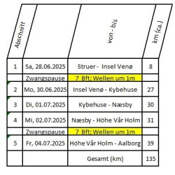 Um 9 Uhr Bootsaufbau im Hafen Struer abgeschlossen. Bereits um 11:30 auf der Insel Vanø gestrandet. Stärkerer Wind von 5 Bft im Venø-Sund. Ein paar früh brech-ende Überraschungswellen fluten das