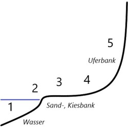 Die denkbar einfachste Gliederung der Vegetation im Loire-Flusskorridor kann sich an fünf bei Mittelwasser (MW) diff-erenzierbaren Standorten orientieren. Die Vegetation