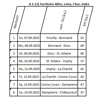 stehende Karte gibt die Tagesabschnitte in hell-, mittel- und dunkelblau wieder.